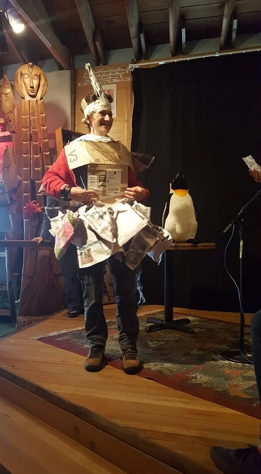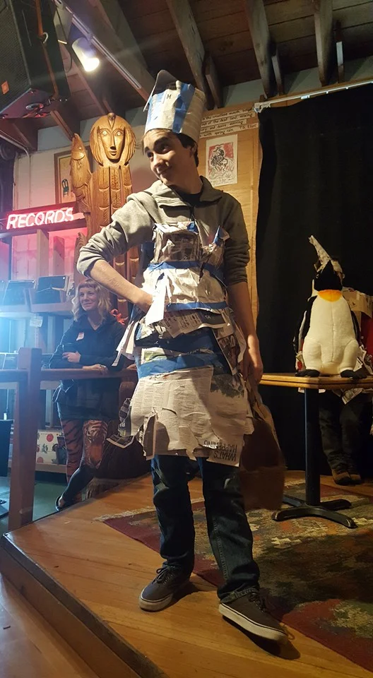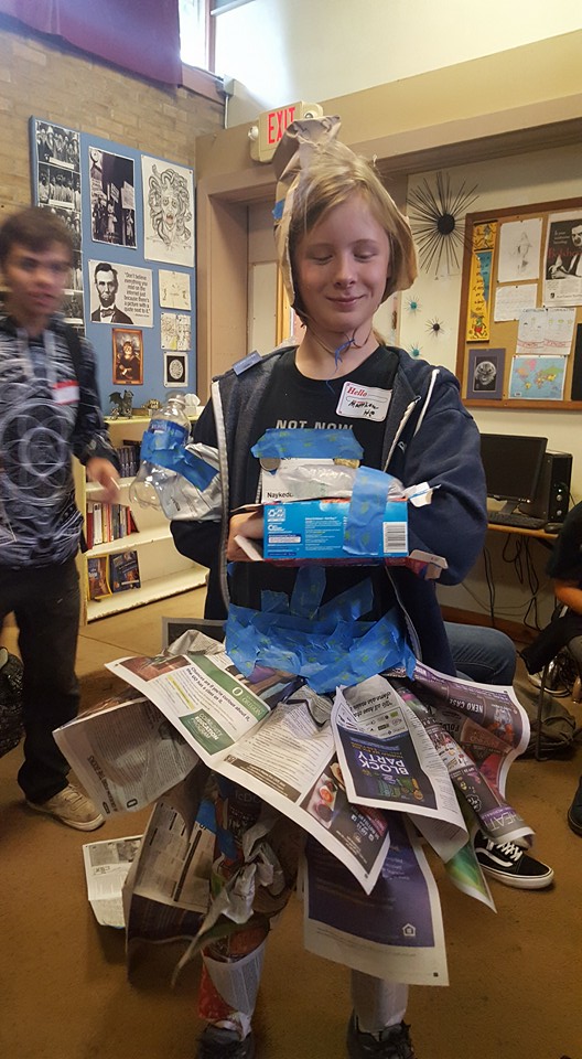 In the photos below, the newspaper in our pieces represents the large number of opinionated statements mixed in with the factual coverage that journalism provides, while also doubling as a stylishly long capes, tutus, dresses, and shin guards. Those pieced provide our heroes the protection of free speech, which shields them from cooperate propaganda. Our heroes are clad with all forms of communication, including mail. Mail once was a part of the postal system, connecting people from across the country with more than just tweets. The packing bags and boxes provide protection from breakage, and represent preservation above all else. The bags in in each piece are holding the wealth of knowledge that is only bought with time.