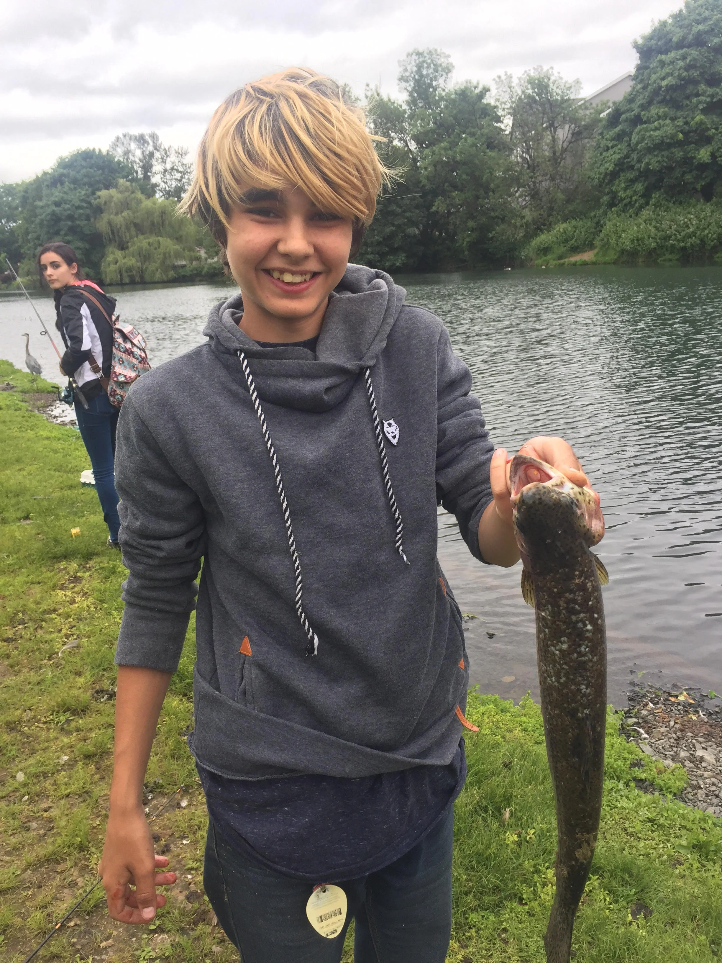 A student shows off his big catch in the Hooked! course offered at Alton Baker Park through Nearby Nature.